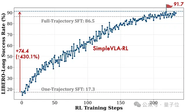 SimpleVLA-RL的核心优势在于显著降低对大规模监督数据的依赖。在仅提供单条演示轨迹(Single-Trajectory SFT)的极端低数据条件下,模型仍能通过强化学习自我迭代提升性能。实验显示,在LIBERO基准中,原本成功率仅为48.9%的OpenVLA-OFT模型,在引入SimpleVLA-RL后跃升至96.9%;而在长序列任务LIBERO-Long上,更是从17.3%飙升至91.7%,展现出惊人的数据效率与学习潜力。