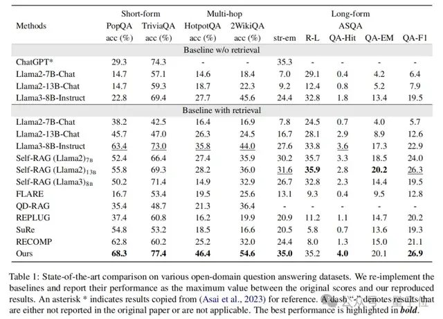 实验结果显示,DRAG在多个主流开放域问答基准上均取得显著提升。在PopQA和TriviaQA等短答案任务中,准确率分别提高4.9%和4.4%;而在更具挑战性的多跳推理任务HotpotQA和2WikiMultiHopQA上,性能跃升10.6%,刷新当前最优水平(SOTA)。在长文本生成任务ASQA中,也在str-em和QA-F1等指标上创下新纪录。更重要的是,该方法展现出极强的通用性,适用于Llama2-7B、Llama2-13B、Qwen2-7B、Alpaca-7B、Mistral-7B等多种主流模型架构,证明其轻量且易于集成。
