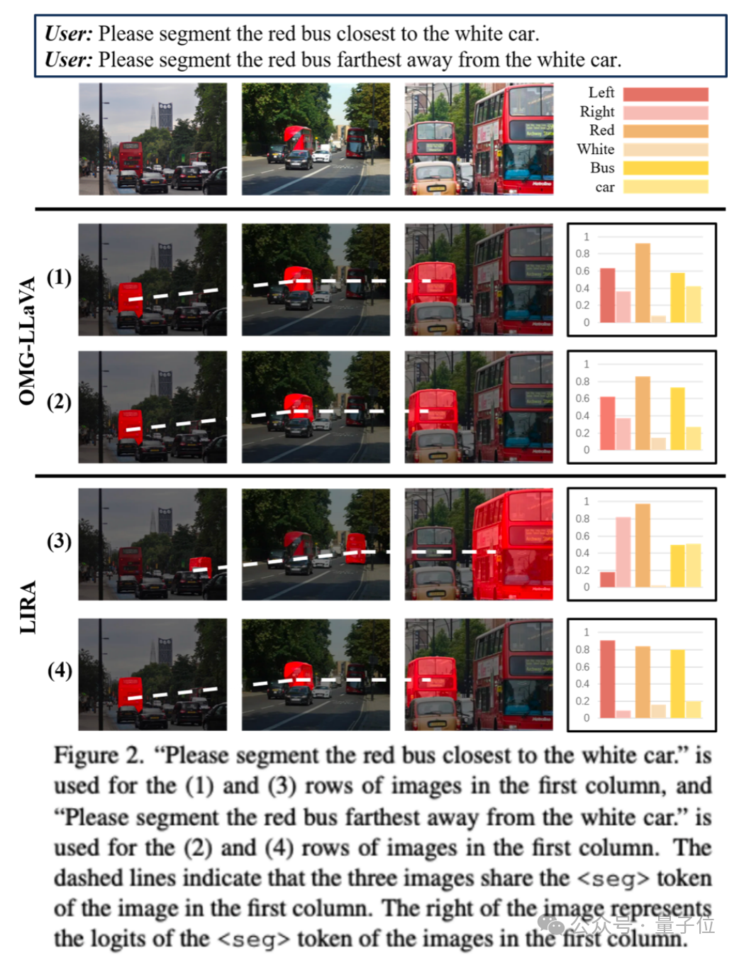 此外,研究团队还深入分析了token在分割任务中的作用机制,发现其logits值能清晰反映被分割对象的关键属性(如方位、颜色),暗示token本身可能蕴含丰富的语义线索。这一发现为未来探索文本与视觉token之间的深层交互提供了新方向。总体来看,LIRA不仅在技术路径上提出了“推理驱动分割”(Inferring Segmentation)的新范式,也为构建更可靠、可解释的多模态系统开辟了新思路。项目代码与论文已开源,欢迎关注GitHub与arXiv链接获取更多细节。