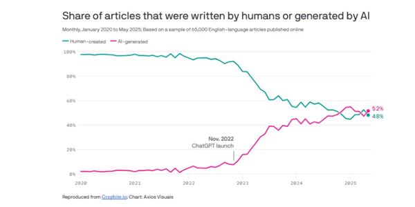 AI的爆发式增长与2022年底ChatGPT的横空出世密切相关。研究指出,在ChatGPT上线后的短短一年内,AI撰写的文章占比迅速攀升至39%,展现出惊人的扩张能力。转折点出现在2024年11月——当月AI生成数量首次超过人类原创,成为网络文字输出的主力军。此后,AI比例持续上升,到2025年上半年已稳定突破半数大关。