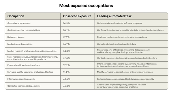 近日,人工智能前沿研究机构Anthropic发布重磅行业报告《AI对劳动力市场的影响:新度量与早期证据》,首次基于其旗舰模型Claude在真实工作场景中的千万级交互日志,系统性揭示AI重塑就业结构的深层逻辑。与大众普遍担忧“低技能岗位首当其冲”不同,该报告指出一个反直觉却已被数据验证的趋势:AI冲击最剧烈的,并非传统意义上的“重复性劳动密集型职业”,而是那些率先规模化、深度化应用AI的高知、高薪、高门槛岗位——技术越先进、拥抱越积极,重构来得越快、越彻底。
