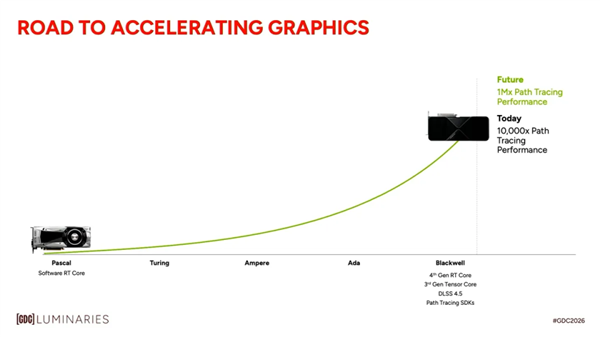 在刚刚落幕的2026年游戏开发者大会(GDC)上,英伟达全球开发者与性能技术副总裁John Spitzer释放了一则震撼行业的技术预言:依托AI驱动的神经渲染技术,未来新一代游戏GPU的实时光线追踪性能,相较2016年发布的Pascal架构(代表产品为GTX 1080系列),有望实现高达100万倍的跨越式提升。这一数字并非理论推演,而是基于当前技术演进曲线与硬件-算法协同优化路径得出的权威预判。