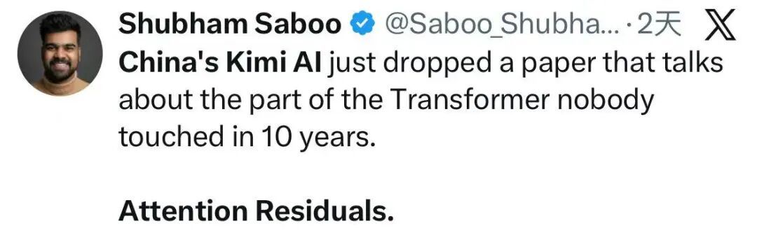 最近,一篇名为《Attention Residuals》的技术论文引发全球AI圈高度关注——不仅因作者团队中包含一名17岁高中生,更因xAI CEO埃隆·马斯克、Google高级AI产品经理Shubham Saboo等重量级人物公开点赞。社交媒体上,“Transformer被颠覆”“硅谷集体破防”等标题刷屏。但冷静审视后我们发现:这并非架构革命,而是一次精准、克制且极具落地潜力的残差连接范式升级。它没有推翻Transformer,却在最基础的“神经网络信息流动方式”上,给出了一条更高效、更可控、更符合长程依赖建模需求的新路径。