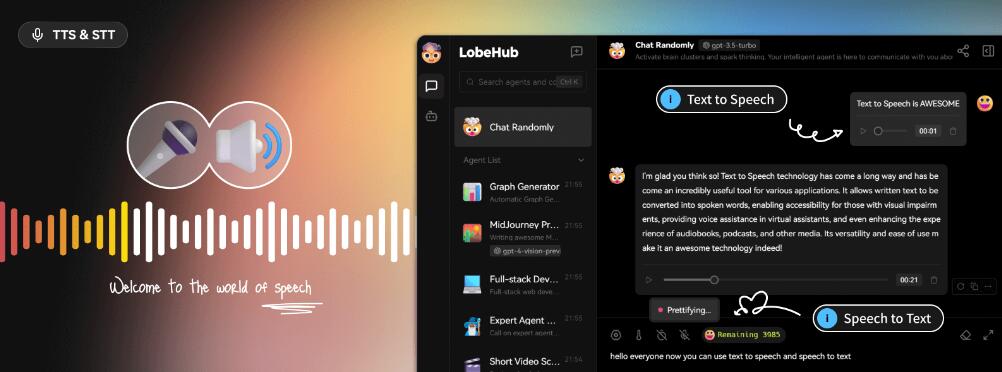 LobeChat 支持文字转语音(Text-to-Speech,TTS)和语音转文字(Speech-to-Text,STT)技术,这使得我们的应用能够将文本信息转化为清晰的语音输出,用户可以像与真人交谈一样与我们的对话助手进行交流。 用户可以从多种声音中选择,给助手搭配合适的音源。 同时,对于那些倾向于听觉学习或者想要在忙碌中获取信息的用户来说,TTS 提供了一个极佳的解决方案。